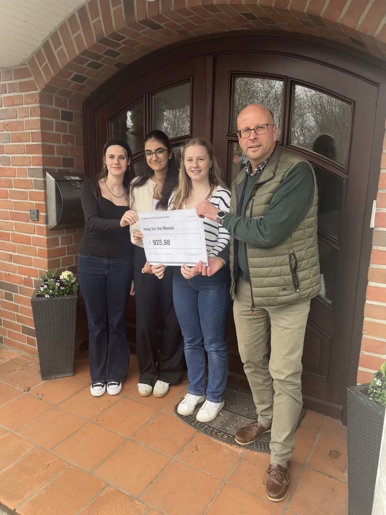 Unsere engagierten Schülersprecherinnen Tara Nienaber, Hevidar Günebakan und Juliane Bustorf übergaben dem Ascheberger Pastor Pastor Jan Philipp Strelow einen symbolischen Check über 925,98 Euro. Das nach dem Schulkonzert gesammelte Geld ist für die Organisation „Help for the Massai“, welche auf ihrer Homepage ausführlich über die vielfältigen Hilfsprojekte für Kinder und Jugendliche aus der Steppe Südkenias und Nordtansanias berichtet: https://www.massai.org/uebersicht/